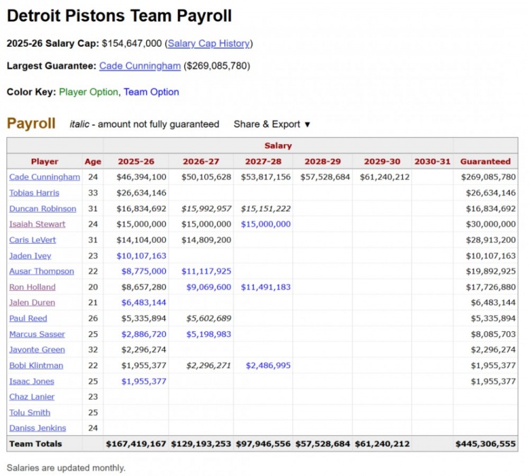 兰登说的没错,在活塞高歌猛进东部第一的当下,他还真没按下加速键。得益于新转播合同的生效,今年活塞薪资只排在联盟倒数第四,到27-28赛季更是只有坎宁安和邓肯-罗宾逊这两笔固定合同。就算杜伦、艾维和奥萨尔都高薪续约,等他们的新合同生效时,活塞也有足够的空间凑足轮换拼图。明后两年夏天,才是活塞逐渐加速运转的契机。